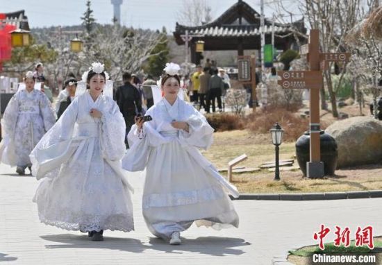 4月7日,在吉林省延吉市的中國朝鮮族民俗園內,游客身著朝鮮族服飾游玩!≈行律缬浾 張瑤 攝