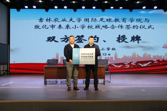 敦化市未來小學校校長吳旭晶同志致歡迎詞。隨后,吉林農業(yè)大學國際足球教育學院副書記趙立剛同志講話,介紹本次合作將以校園足球發(fā)展為核心,以課程共建與師資培訓為重點,著力構建校地協(xié)同的長效機制。儀式現場,敦化市教育局與吉林農業(yè)大學國際足球教育學院簽署了《校外實踐教學基地共建協(xié)議書》,吉林農業(yè)大學國際足球教育學院張志成院長授牌。授牌結束后,吉林農業(yè)大學國際足球教育學院向未來小學捐贈了足球訓練裝備,以實際行動為校園足球發(fā)展助力。與此同時,學校向長期支持教育的企業(yè)代表贈送錦旗,企業(yè)代表分享了助力教育發(fā)展的理念。