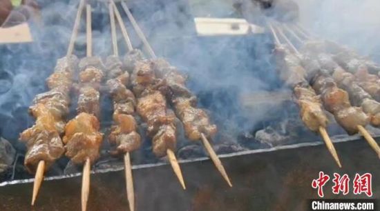 活動(dòng)現(xiàn)場(chǎng),多種新鮮食材在炭火的炙烤下散發(fā)出陣陣香氣。除了傳統(tǒng)的烤肉串之外,還有烤全羊、烤河蚌、烤鯽魚(yú)等菜品。