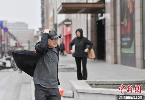 3月12日,長春市迎來大風天氣,市民捂住帽子在風中行走。 張瑤 攝