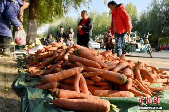 10月16日,吉林長(zhǎng)春,市民在挑選胡蘿卜。當(dāng)下正是中國(guó)東北民眾“囤秋菜”的季節(jié),滿載大蔥、白菜、胡蘿卜等秋菜的貨車停靠在長(zhǎng)春市區(qū)指定銷售區(qū)域,市民們穿梭挑選,忙碌地儲(chǔ)備過冬秋菜。中新社記者 張瑤 攝