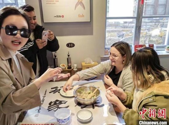 圖為外國留學(xué)生在山東煙臺(tái)學(xué)習(xí)包鲅魚水餃!≈行律缬浾 李長亮 攝