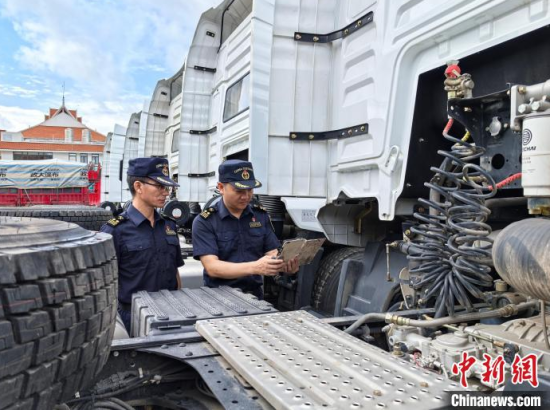 海關(guān)關(guān)員在關(guān)累港口岸對(duì)出口重卡牽引車(chē)開(kāi)展查驗(yàn)!】得 攝