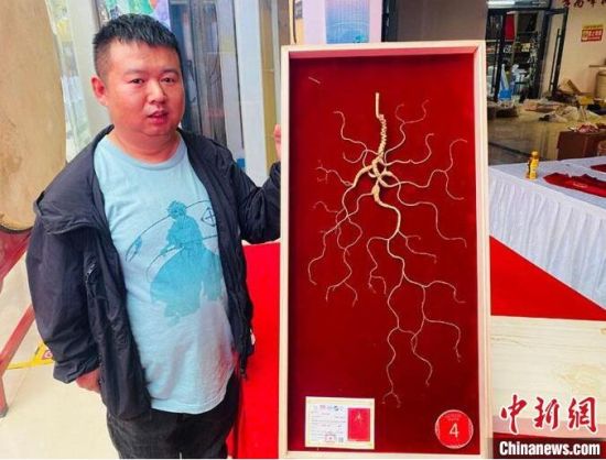 據(jù)了解,脫穎而出的“野山參王(干品)”有著百年參齡,主人是來自吉林省白山市的參商張雯溥!斑@次帶來的野山參五形特別好,皮老紋深,參須柔韌性強,有彈性,蘆、紋、體、皮色、須可以說都屬上乘。”