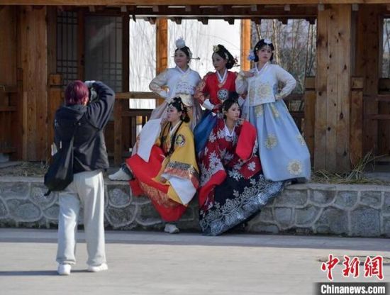 11月4日,在吉林省延邊朝鮮族自治州延吉市的中國朝鮮族民俗園內(nèi),游客身著朝鮮族服飾拍照留念。延邊是中國最大的朝鮮族聚居區(qū),濃郁的民族風(fēng)情吸引大量游客前來觀光體驗。