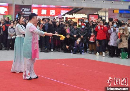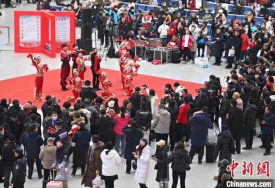 1月26日,在長春站候車大廳,長春站、沈陽鐵路公安局長春公安處等多個部門聯(lián)合為旅客帶來了系列精彩表演, 吸引大批過往旅客駐足觀看、參與。當(dāng)天,2024年春運啟動。2024年春運自1月26日開始至3月5日結(jié)束,為期40天。春運期間,長春站預(yù)計發(fā)送旅客341萬人次,日均8.5萬人次。(完)