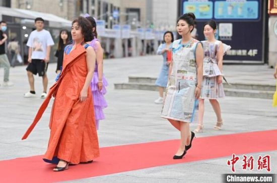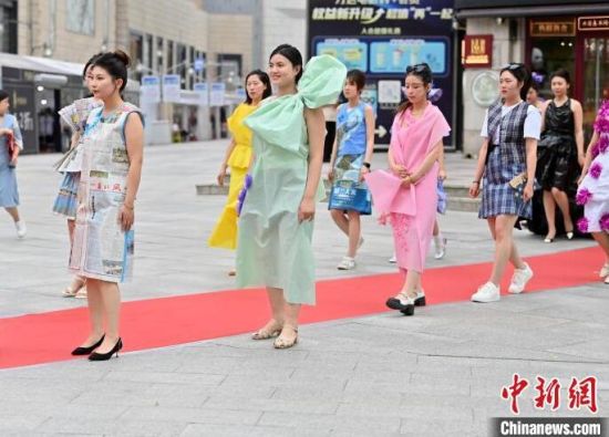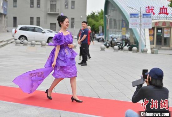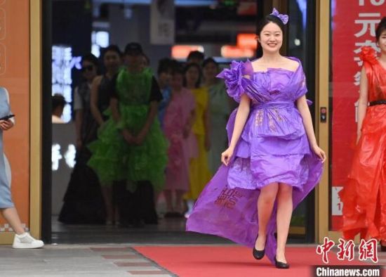 6月5日,吉林長春,模特身穿綠色環(huán)保時裝走秀。值此世界環(huán)境日來臨之際,長春開展“塑制霓裳·環(huán)保領(lǐng)航”綠色環(huán)保時裝秀表演活動。民眾將廢舊的報紙、塑料袋等廢舊物品變成了美麗的衣裳,宣傳環(huán)保意識。張瑤 攝