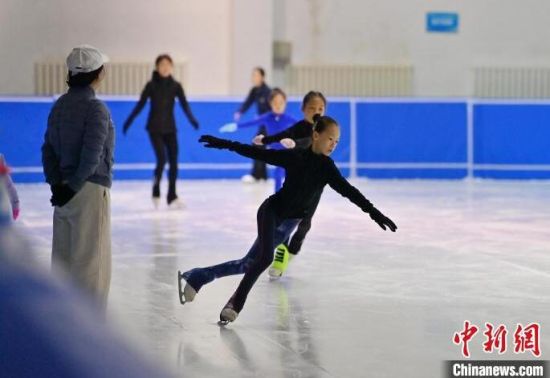 8月14日,在長(zhǎng)春市冬季運(yùn)動(dòng)管理中心內(nèi),小運(yùn)動(dòng)員在進(jìn)行花樣滑冰訓(xùn)練。正值暑假,花滑小將們?cè)诮叹殏兊闹笇?dǎo)下積極練習(xí),為了自己的體育夢(mèng)想拼搏。中新社記者 張瑤 攝