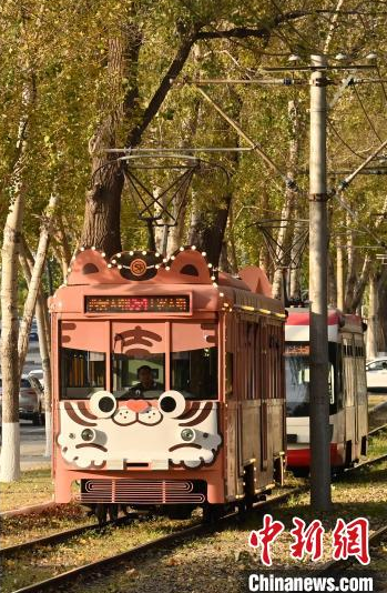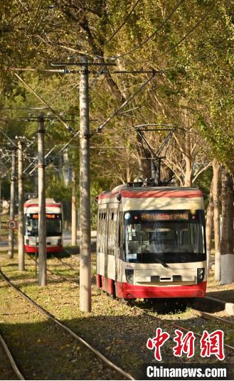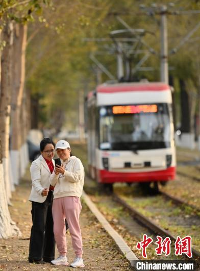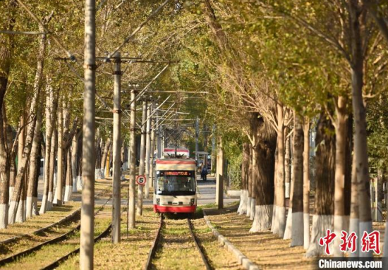 10月9日,吉林長(zhǎng)春,一輛有軌電車在泛黃的樹木中行駛,呈現(xiàn)出別有韻味的秋季景致,吸引游客打卡。中新社記者 張瑤 攝