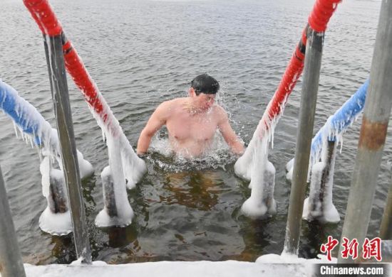 2月7日,在長(zhǎng)春市南湖公園內(nèi),冬泳愛(ài)好者在零下19攝氏度的嚴(yán)寒天氣中冬泳鍛煉身體。 中新社記者 張瑤 攝