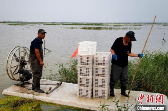 養(yǎng)殖戶捕撈河蟹。(資料圖) 潘晟昱 攝