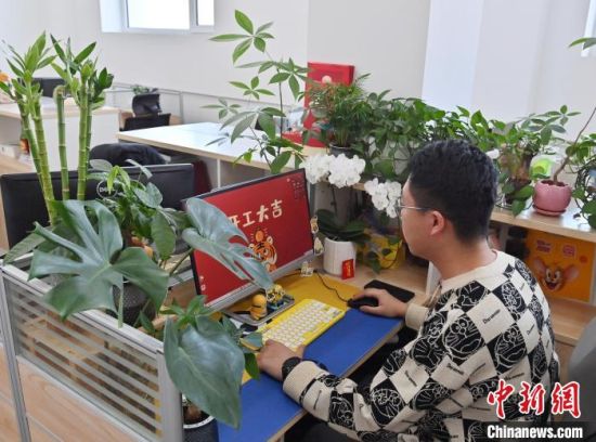 2月14日,吉林長(zhǎng)春,一名員工將工位改造成“森系工位”!埇 攝